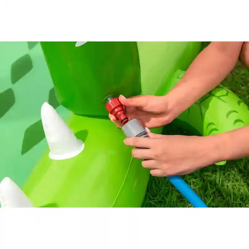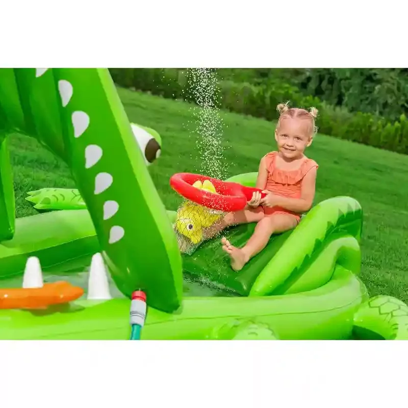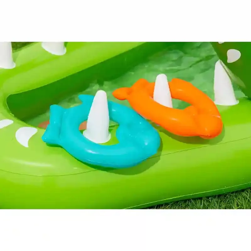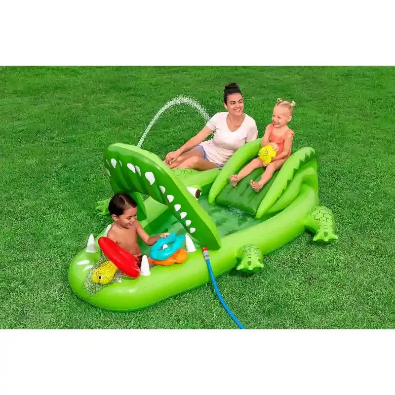 A Bestway puhafalú aligátoros medence játszótér egyszerűen felfújható. A medence tartós, nagy vastagságú vinyl anyagból készült. Könnyen összehajtható utazáshoz vagy tároláshoz. A csomagolás a felfújható medencén kívül egy hálót, két halat, két gyűrűt és egy javító foltot is tartalmaz. A beépített spriccelő funkció használatához a kerti slaghoz szükséges csatlakoztatni.