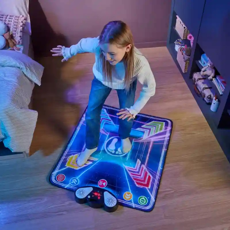 A Dance Mat interaktív táncszőnyeg izgalmas tánc- és mozgásjátékokra hív, a Dance Dance Revolution stílusában. Nincs szükség külön eszközre, ugyanis a szőnyegen 8 különböző dal található (nem módosíthatók a szőnyegen lévő dalok!) a 8 nehézségi szinthez, de akár kedvenc dalaid is megszólalhatnak a szőnyeg hangszóróján keresztül, ha a készletben lévő kábel segítségével összekötöd pl. a telefonoddal. Ezután állítsd be a hangerőt és nehézségi fokozatot, majd kezdődhet is a tánc! A táncszőnyeg jelzi, hová lépj, és a cél, hogy ne hibázz a lépéseknél! Választhatsz két módból: tánc vagy memória. A LED kijelző mutatja az elért szintet és a pontszámokat. A Digital Dance Mixer táncszőnyeg kiváló hangminőséget biztosít, így a mozgás és a zene még élvezetesebbé válik. Ajánlott minden táncrajongó gyereknek és fiatalnak. A készletben 3,5mm jack dugós kábel található, ezért átalakítóra szükség lehet (pl. telefonhoz való csatlakoztatáshoz, ha nincs rajta ilyen foglalat)!