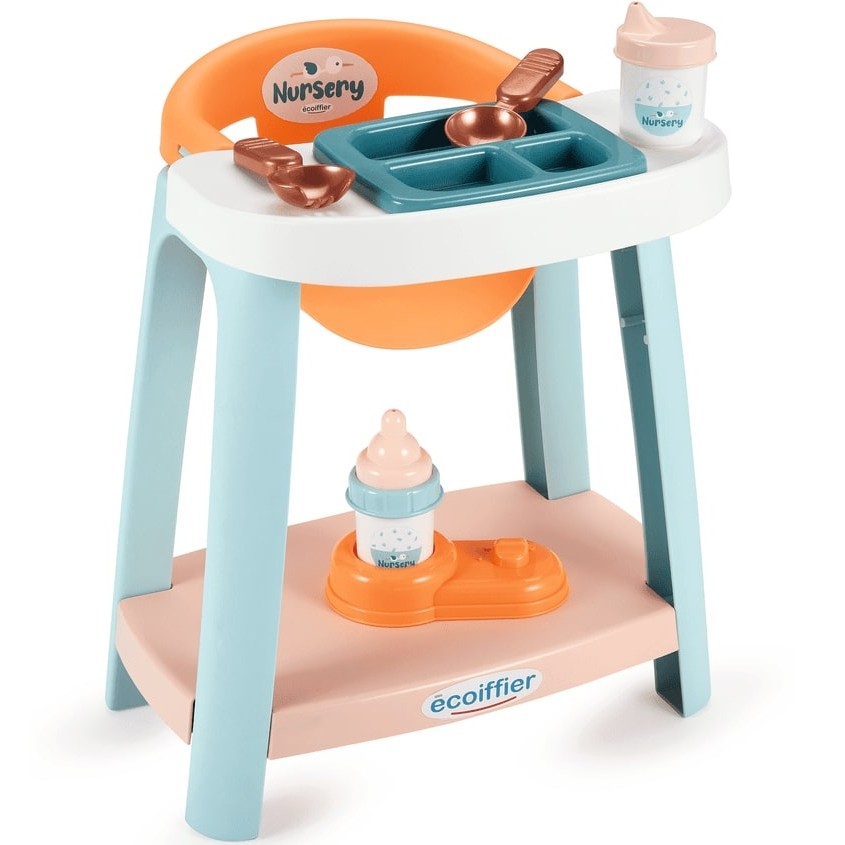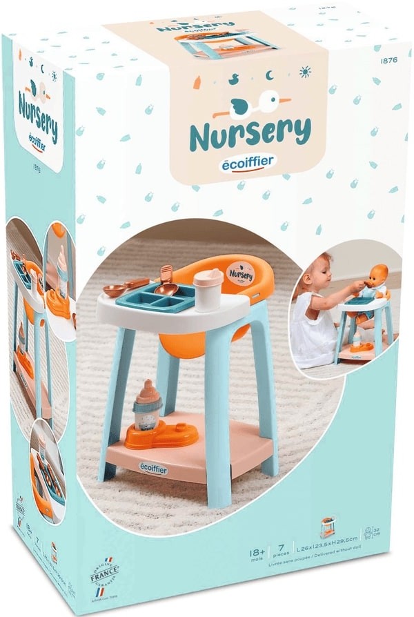 Az Écoiffier etetőszék minden kis anyukának nagyszerű segítség a kedvenc babájának etetésekor. A készlet tartalmaz egy 3 részre osztott tányért, kanalakat, poharat és cumisüveget tartóval. A termék maximum 32cm méretű játékbabákhoz használható. A termék összeszerelést igényel.