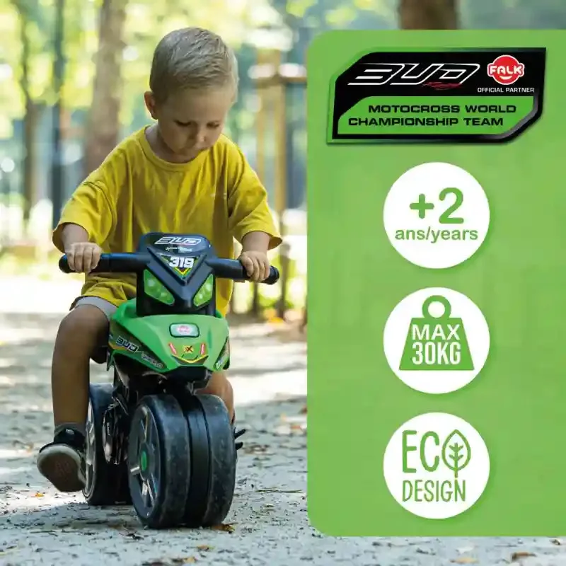 Ez a látványos kormányozható Falk K-MX Bud Racing Team motor bébitaxi tökéletes választás a kis motorrajongók számára, akik szeretnék kipróbálni az első „vezetési” élményeiket. A modell a versenymotorok világából merít inspirációt, így igazi sportos hangulatot visz a mindennapi játékba. A lábbal hajtható kialakítás természetes mozgásra ösztönzi a gyerekeket, miközben fejleszti az egyensúlyérzéket és a motorikus készségeket. A széles kerekek stabil alapot biztosítanak, így a kicsik biztonságosan gyakorolhatják a közlekedést, akár beltéren, akár a szabadban. A csendes, „néma” kerekek különösen praktikusak beltéri használat során, mivel nem zavarják a környezetet. A masszív szerkezet és a kormányrúd segíti az irányítást, így a gyerekek könnyedén manőverezhetnek. A kb. 75,5 × 40 × 50 cm-es méret és a 35 cm-es ülésmagasság ideális a 2–5 éves korosztály számára, maximális terhelhetősége 30 kg. Ez a strapabíró és stílusos gyermek motor remek társ a mindennapi kalandokhoz, miközben játékosan fejleszti a mozgást és önbizalmat ad a kicsiknek.