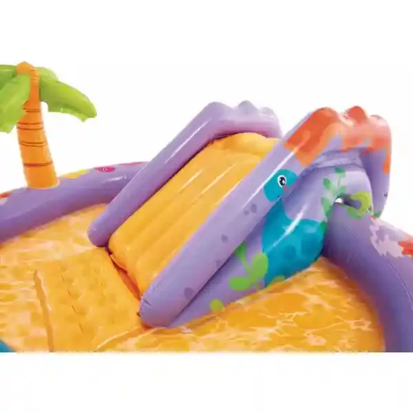 Az Intex puhafalú dinoszaurusz medence játszótér egyszerűen felfújható. Csússz le a vulkánon és csobbanj a medencébe, hogy átdobd a dínó tartotta karikán a színes labdákat. A medence tartós, nagy vastagságú vinyl anyagból készült. Könnyen összehajtható utazáshoz vagy tároláshoz. A medence vize könnyen leereszthető az erre kialakított szelepen keresztül. A csomagolás a felfújható medencén kívül 6db felfújható labdát és javító foltot is tartalmaz. A beépített spriccelő funkció használatához a kerti slaghoz szükséges csatlakoztatni.