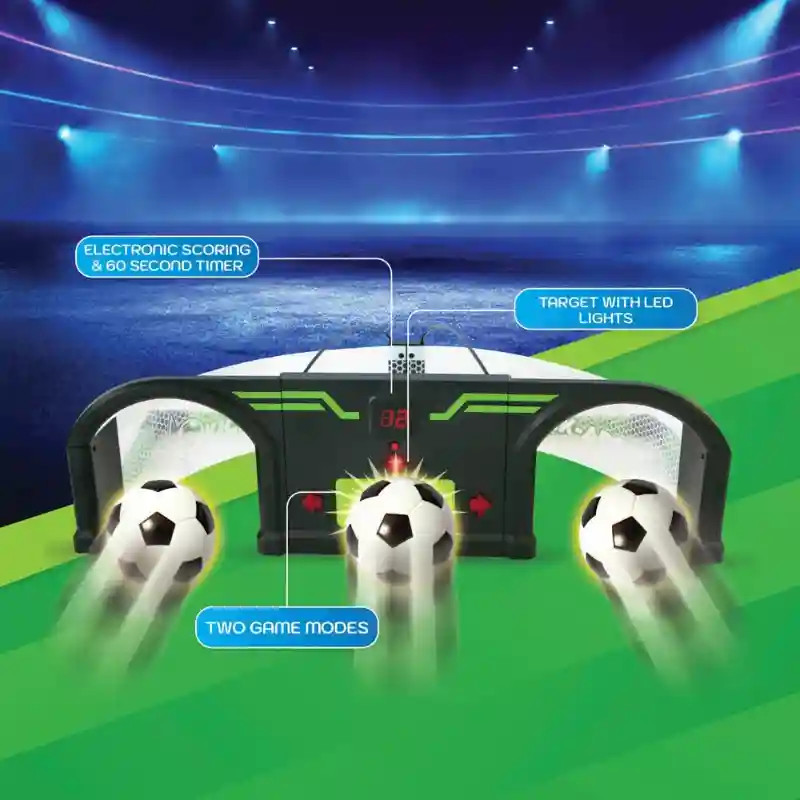 Ez az interaktív futballedző játék segít a gyerekeknek fejleszteni futballtudásukat, miközben szórakozva edzenek. Csak rúgd a labdát a kapuba, amelyet az elektronikus céltáblán megjelenő LED nyilak mutatnak. Minden játék 60 másodpercig tart, így gyors és izgalmas edzéseket biztosít. A készlettel két játékmódra van lehetőség: az edzésmódban a nyilak előre meghatározott sorrendben világítanak, hogy a gyerekek gyakorolhassák az alapokat; a kihívásmódban a nyilak véletlenszerű sorrendben villannak fel, a középső nyíl pedig extra szórakozást és nehezítést ad a játéknak. Ideális ajándék minden kis focirajongónak, akik szeretnek játszva fejlődni és új kihívásokat kipróbálni.