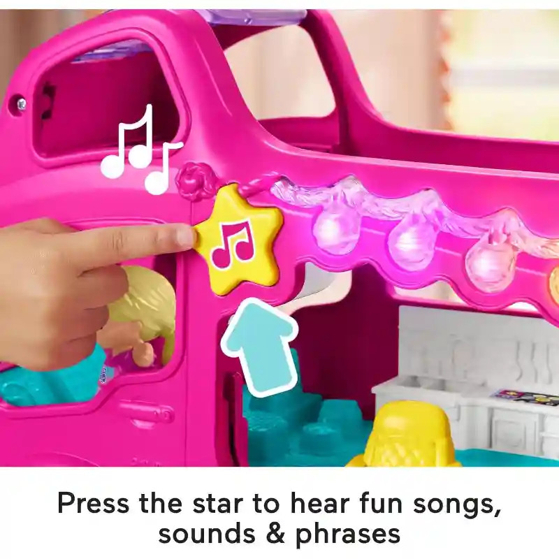 A Fisher-Price Little People - Barbie interaktív lakóautója varázslatos játékélményt kínál a legkisebbeknek, ahol a gyerekek zenével, fénnyel és sok-sok felfedeznivalóval teli utazásra indulhatnak. A jármű tolható, és ha kinyílik, egy interaktív játékkészletté alakul, amely tele van Barbie témájú részletekkel. A csillag alakú gomb vagy a sofőrülésbe helyezett figura megnyomásával több mint 35 dallam, hang és mondat aktiválható. A földgömb gomb segítségével kiválasztható a kívánt nyelv: brit angol, német vagy francia. A felső szint csúszdává és medencévé alakítható, az oldalsó ajtó egy teraszt nyit meg, a hálókabin és a hűtőszekrény kinyitható, a figurák pedig beleültethetők a székekbe vagy akár a kis bilire is – pont, mint egy igazi kempingezésnél. A Little People Barbie interaktív lakóautó játék közben segíti a gyerekeket a finom- és nagymozgások fejlesztésében (tolás, nyitás, fogás, mozgatás), a nyelvi és kommunikációs készségek fejlődésében, a képzelőerő és történetmesélés ösztönzésében.