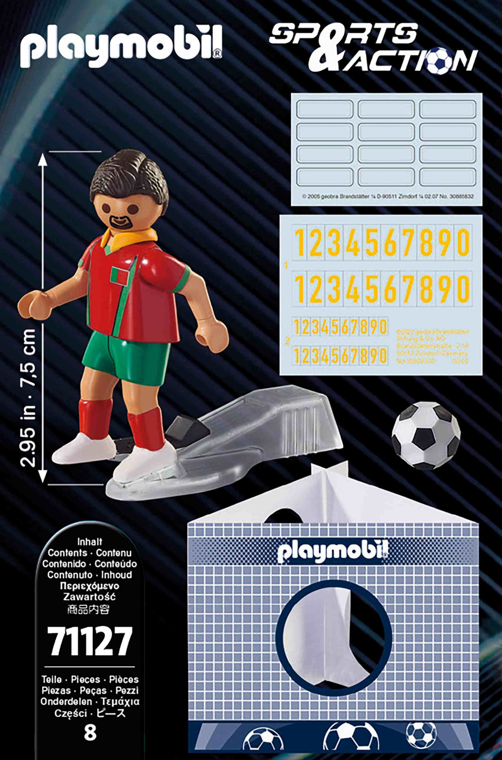 Természetesen minden résztvevő nemzet meg akarja nyerni a bajnokságot, így a portugál válogatott játékos is nagyon motivált. Vajon ki emelheti a magasba a serleget a bajnokság végén? A praktikus, egykezes rúgás funkciónak köszönhetően mind a lapos, mind a magas lövések pontosan kivitelezhetőek. Nyerd meg a bajnokságot a portugál válogatott focistával! A játék remek kiegészítője lehet a Playmobil 71120 Focistadion készletnek. A mellékelt üres címkékkel a figura felcímkézhető a kedvenc játékos nevével és mezszámával. A játék tartalmaz egy karton falat és egy labdát is a lövések gyakorlásához.