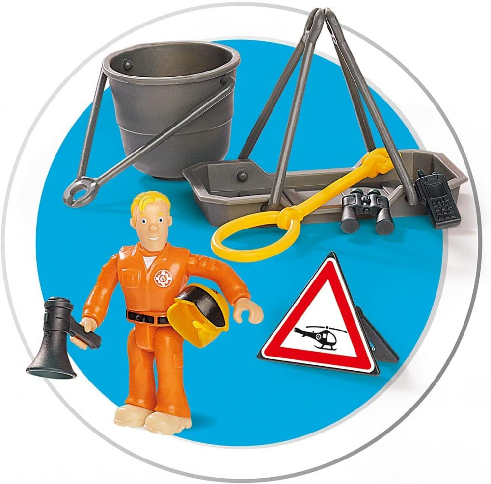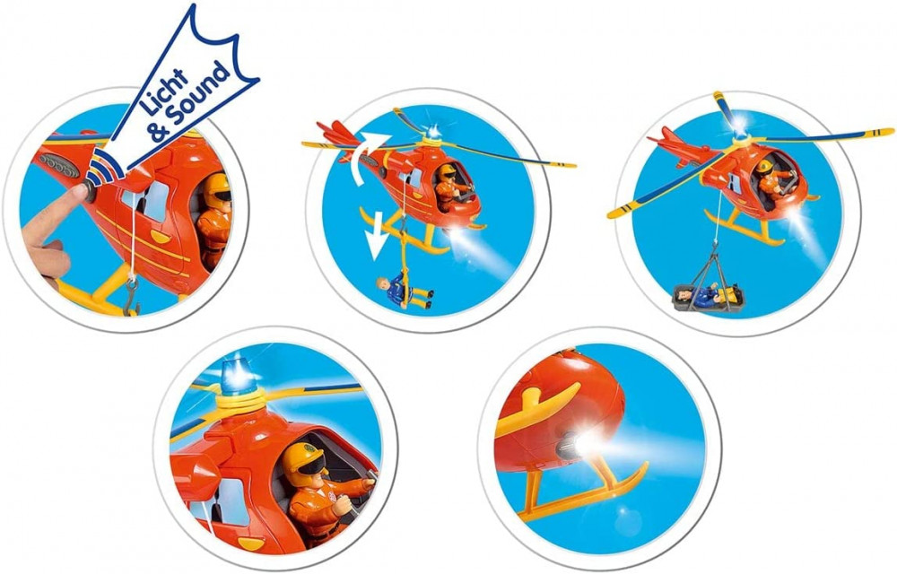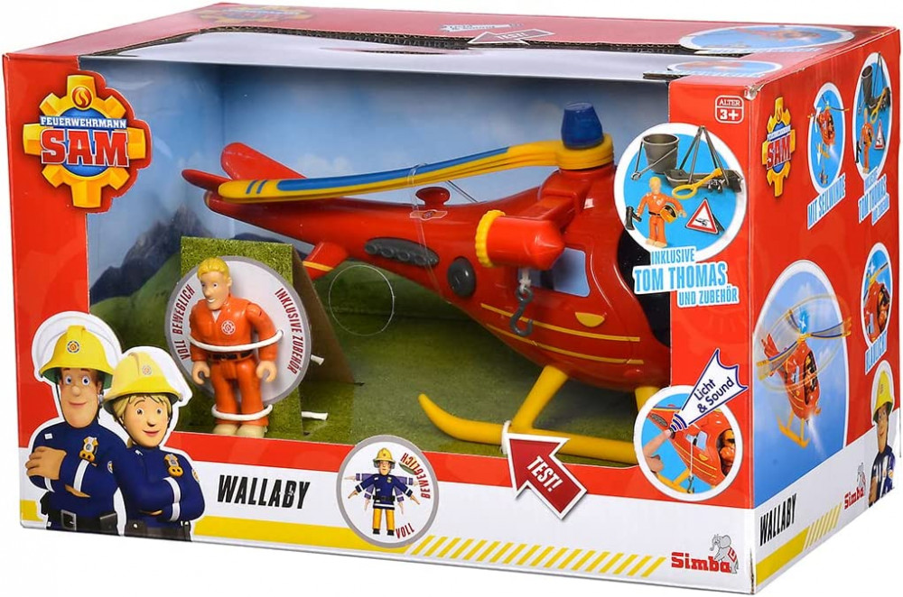 Sam a tűzoltó - Wallaby mentőhelikopter Tom figurával a kicsik kedvenc meséjéből! Sam tűzoltó csapatának járművét Tom pilóta vezeti. A mentésre kiválóan alkalmas helikopterrel a legveszélyesebb helyekre is könnyen el lehet jutni. Wallaby helikopter gombnyomásra hangot ad és világít, rotorja kézzel forgatható, és még egy világító reflektorral is fel van szerelve. A helyszínre érve a leereszthető mentőágy segítségével Tom kimenti a bajba jutottat és biztonságos helyre szállítja. A helikopter tetején lévő kék lámpa villog, így mindenki már messziről látja, hogy érkezik a segítség. A játék helikopter 3 db 1,5 V-os R03/AAA elemmel működik, melyet a csomagolás nem tartalmaz. Gyűjtsd össze Sam tűzoltócsapatának járműveit is és induljon a mentőakció! Tom figura karjai és lábai mozgathatók.